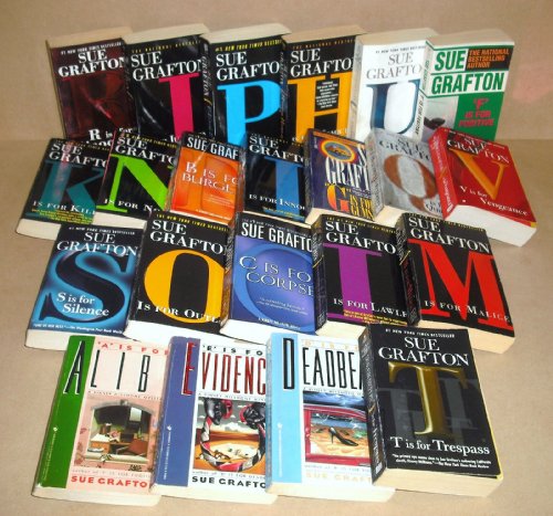 Set of 22 Sue Grafton Kinsey Millhone novelsKinsey Millhone/22 book set: A is for Alibi/B Burglar/C Corpse/D Deadbeat/E Evidence/F Fugitive/G Gumshoe/H Homicide/I Innocent/J Judgment/K Killer/L Lawless/M Malice/N Noose/O Outlaw/P Peril/Q Quarry/R Ricochet/S Silence/T Trespass/U Undertow/V Vengeance by Sue Grafton